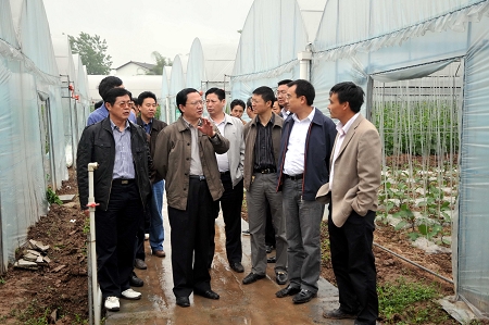 在当地党政负责人的陪同下,哈文华一行前往楠木村新建的大棚蔬菜基地,查看蔬菜长势,了解蔬菜销售及管理情况。