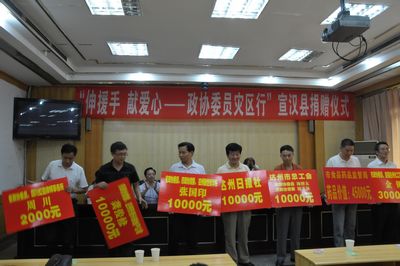 李志兴说,为了发挥政协优势,助推灾后恢复重建,市政协在全市各级政协组织、广大政协委员中广泛开展了“伸援手献爱心——政协委员灾区行”活动。市政协二届二十八次常委会上,审议通过了政协达州市委员会开展“伸援手 献爱心——政协委员灾区行”活动的倡议书,并组织了捐款。今天,市政协又组织部分政协委员来到宣汉县进行现场捐款。