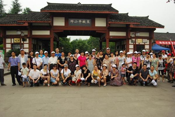 在“邓小平故里”大门前,农工党员们合影留念。他们穿过青松翠柏的树林,满塘的荷花清香扑鼻,双眼时刻留意着道路两旁的石碑,很快就来到了邓小平的石雕像前,总支部“请”来了鲜花,恭敬地摆放在了他的面前。