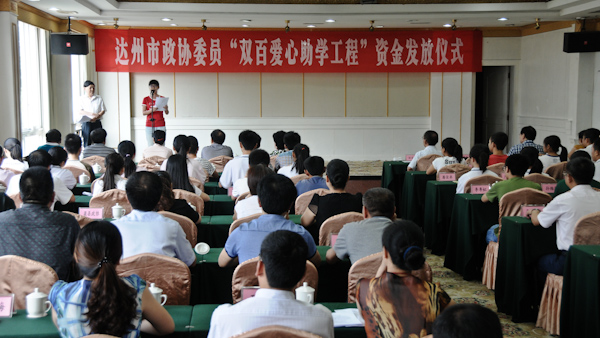 8月19日,市政协委员“双百爱心助学工程”资金发放仪式在达州宾馆举行。市政协主席康莲英,副主席刘方棠、郑友清、秘书长魏艳出席仪式,并为30名受助学生代表发放助学金。市政协副主席郝德恒主持仪式。80名优秀贫困学生获得了18万元爱心助学款。