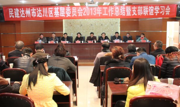 2013年12月28日,民建达州市达川区基层委员会在区林业局八楼会议室召开了2013年工作总结暨支部联谊学习会。达州市政协副主席、民建达州市委主委王善国,副主委黄绚珠、曾祥国,中共达川区委统战部部长温南其,副部长周兴权等领导应邀出席了会议,民建达川区全体会员参加了会议。会议由民建达川区副主委邓立主持。