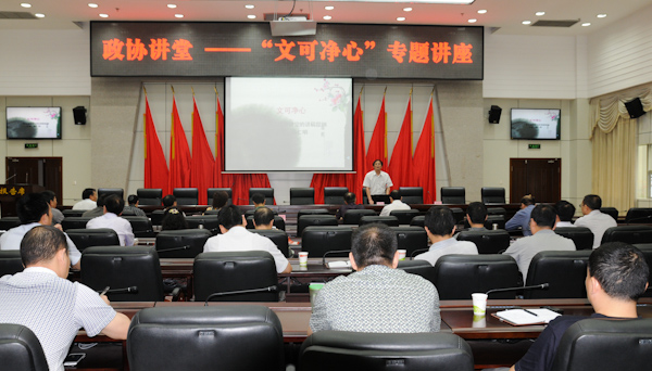 6月5日,“政协讲堂”文学专题讲座在市政协六楼议政厅开讲。市政协副主席王善国、郑友清、黄建琴、彭飚、郝德恒,秘书长魏艳,市政协机关干部职工和部分政协委员聆听讲座。