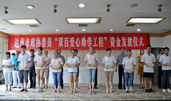 8月19日,市政协委员“双百爱心助学工程”资金发放仪式在达州宾馆举行。市政协主席康莲英,副主席刘方棠、郑友清、秘书长魏艳出席仪式,并为30名受助学生代表发放助学金。市政协副主席郝德恒主持仪式。80名优秀贫困学生获得了18万元爱心助学款。